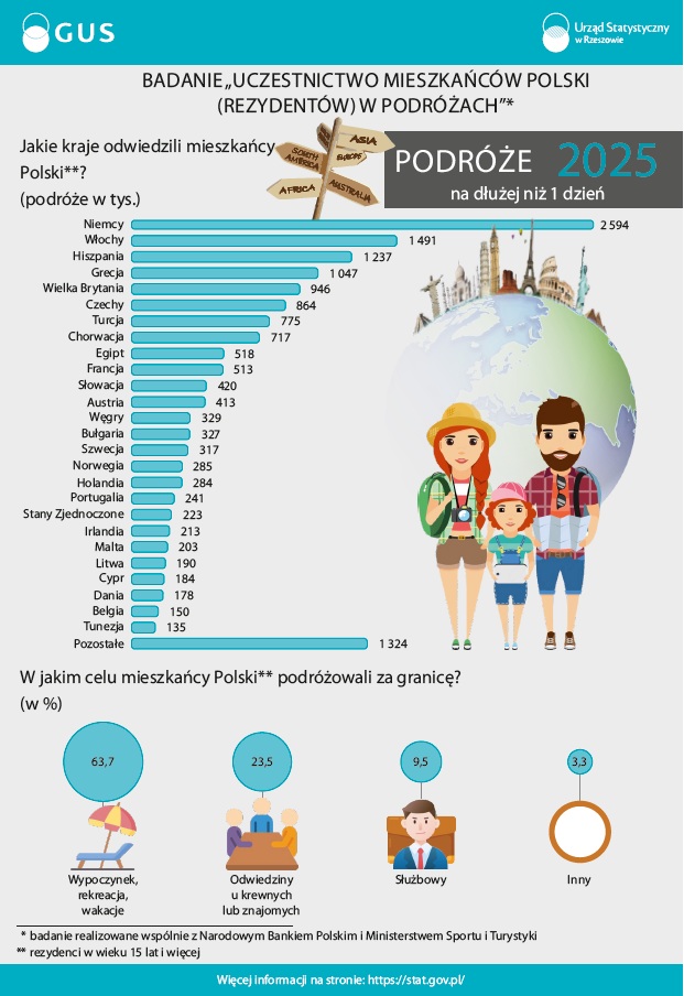 lub służbowych) członków gospodarstw domowych w I kwartale 2026 roku. Badanie dostarczy kompleksowej wiedzy m.in o skali uczestnictwa mieszkańców Polski w podróżach, rodzajach wykorzystywanych usług turystycznych, poziomie wydatków związanych z podróżami.