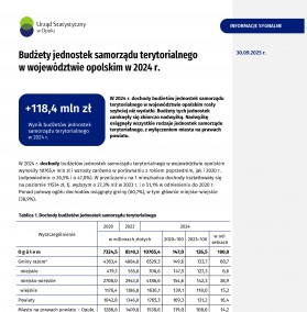 W 2024 r. dochody budżetów jednostek samorządu terytorialnego w województwie opolskim rosły szybciej niż wydatki. Budżety tych jednostek zamknęły się zbiorczo nadwyżką. Nadwyżkę osiągnęły wszystkie rodzaje jednostek samorządu terytorialnego, z wyłączeniem miasta na prawach powiatu.