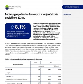 Opracowanie przedstawia dane dotyczące budżetów gospodarstw domowych w województwie opolskim. Zawiera informacje dotyczące przeciętnych miesięcznych dochodów i wydatków, przeciętnego miesięcznego spożycia artykułów żywnościowych oraz wyposażenia gospodarstw domowych w przedmioty trwałego użytkowania.